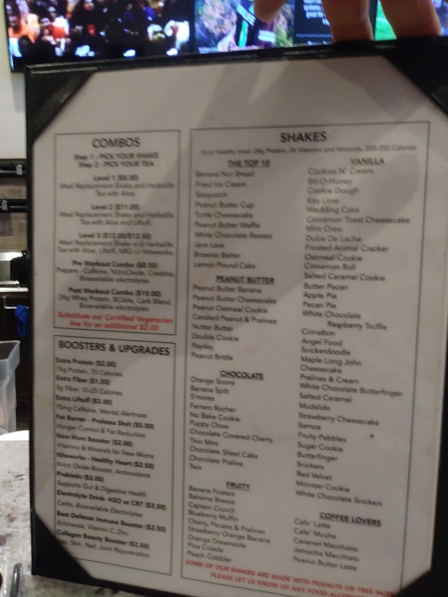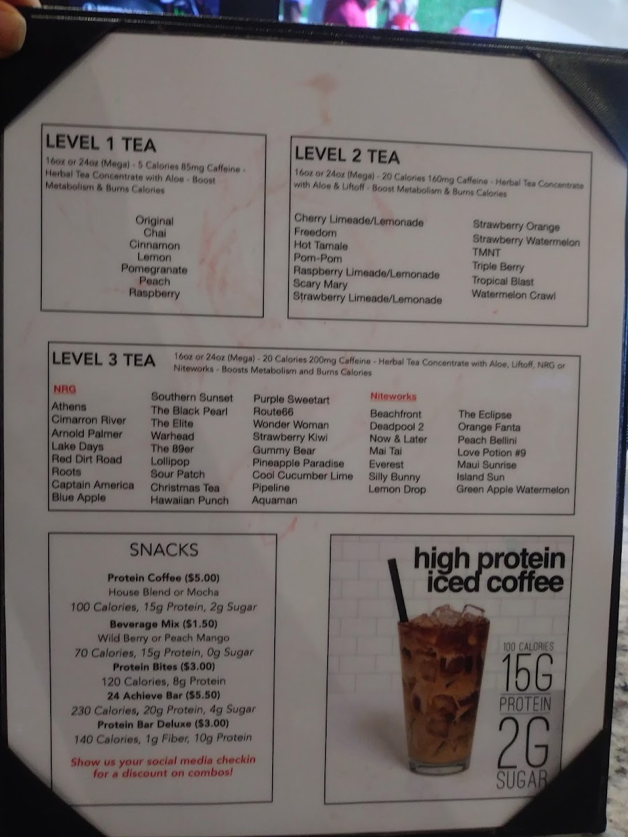 Regular size tea and protein shake. Comes with aloe shot in the Tea. Choose a flavor: (Choco. Chip) Cookie Dough, Almond Joy, Apple Crisp with Berries, Apple Pie, Banana AlMond Cheesecake